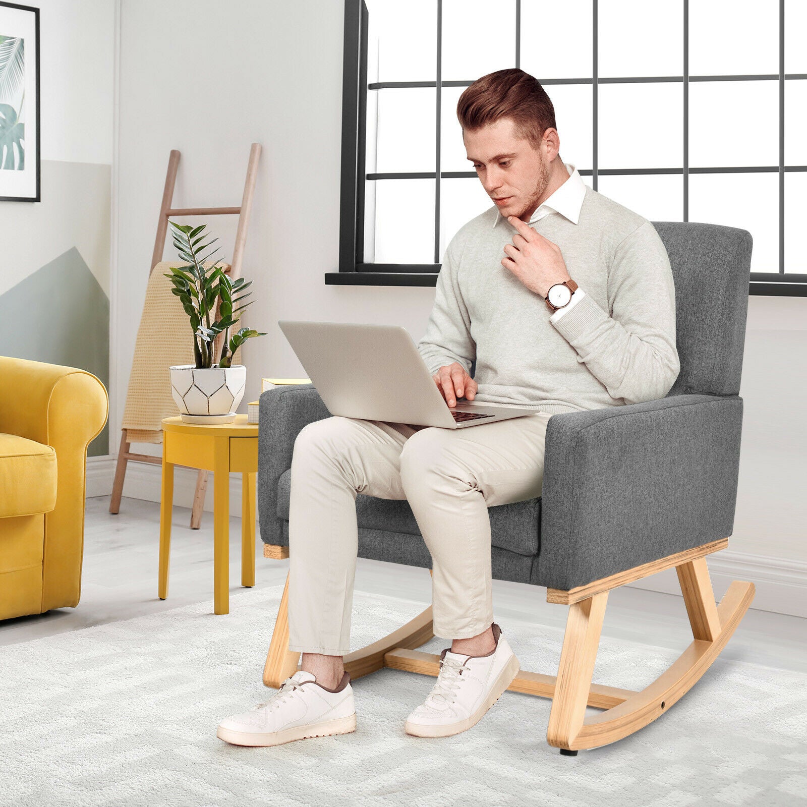 This rocking chair will offer you extra comfort and new sitting experience. Do not hesitate to buy it now! Comfortable Rocking Experience: Equipped with two loop rocker feet that connected with one horizontal wooden bar, this rocking chair will give you comfort and safety sitting experience. There are four protective pads at the base bottom to prevent the floor from being scratched while the chair is rocking. Sturdy & Durable Construction: The entire frame is made of solid wood which is sturdy enough to support up to 120kg and durable for long time use. Covered with high-quality fabric and filled with high-density and soft sponges, this chair provides you with a comfortable and soft sitting experience. High Backrest and Cozy Armrest: This ergonomic chair can give you strong support for your whole body. Wide and high backrest provides you with great comfort and when you lean on it or rock it. What's more, padded armrest compared with other wood armrest is more comfortable and ergonomic. Thickly Padded Seat Cushion: Designed with a thick cushion and high-density sponge inside, the whole recreational rocking chair is soft enough for you to enjoy yourself and relax your body after tiring work. Its fabric slipcover is wear-resistant and skin-friendly. Simple Assembly and Maintenance: Provide with detailed instruction, the leisure chair can be installed in a short time. Because of its smooth surface, this chair is easy to maintain and clean.