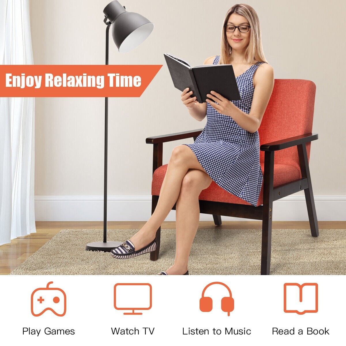 SKU: HW65639JS || Modern Upholstered Linen Fabric Accent Sofa Chair with Wooden Armrest-Orange