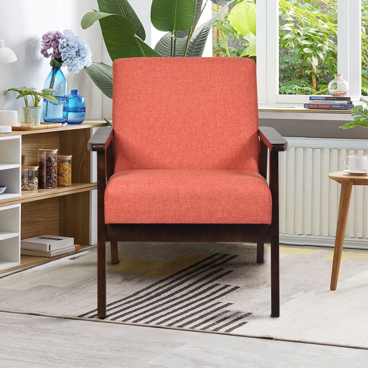 Modern Upholstered Linen Fabric Accent Sofa Chair with Wooden Armrest-Orange