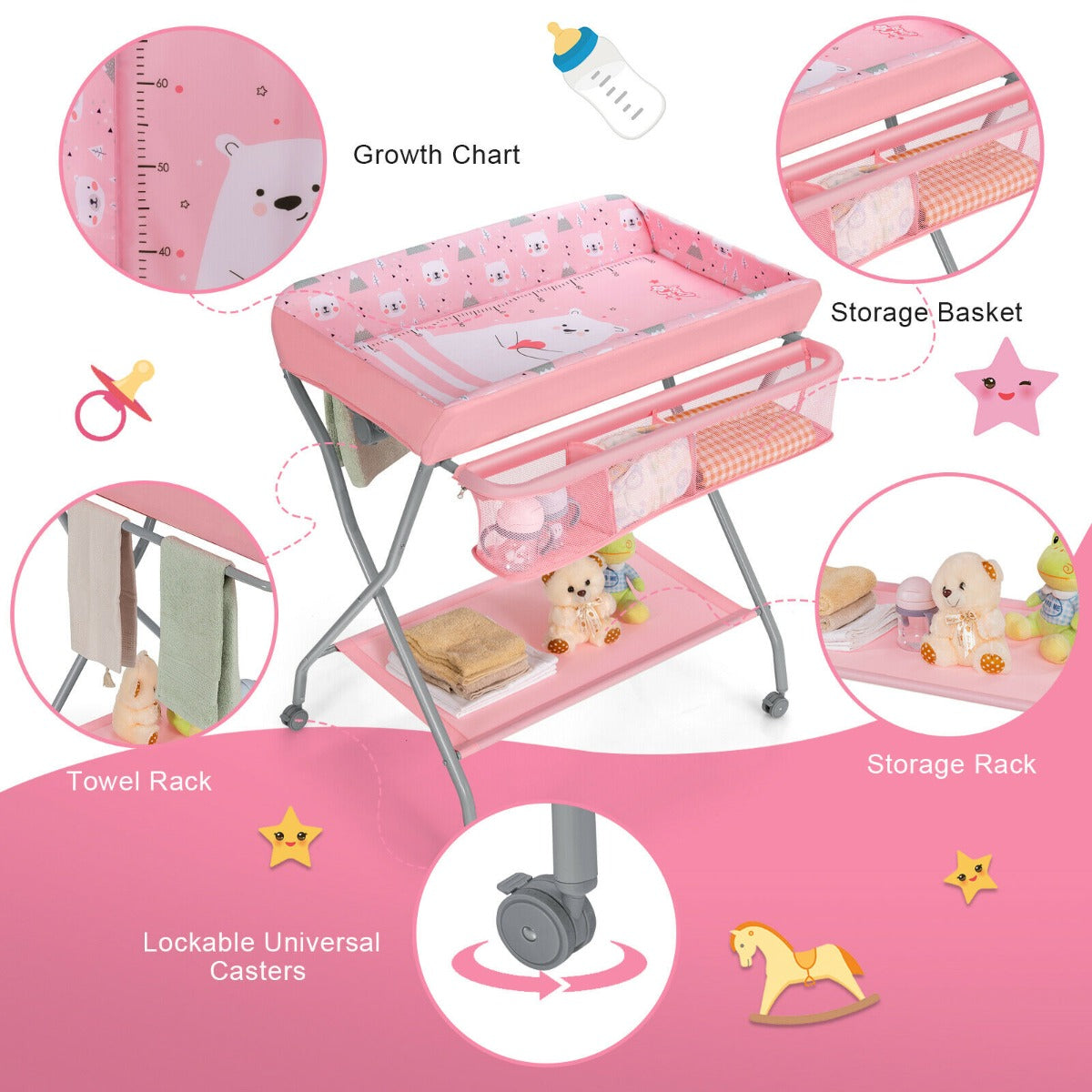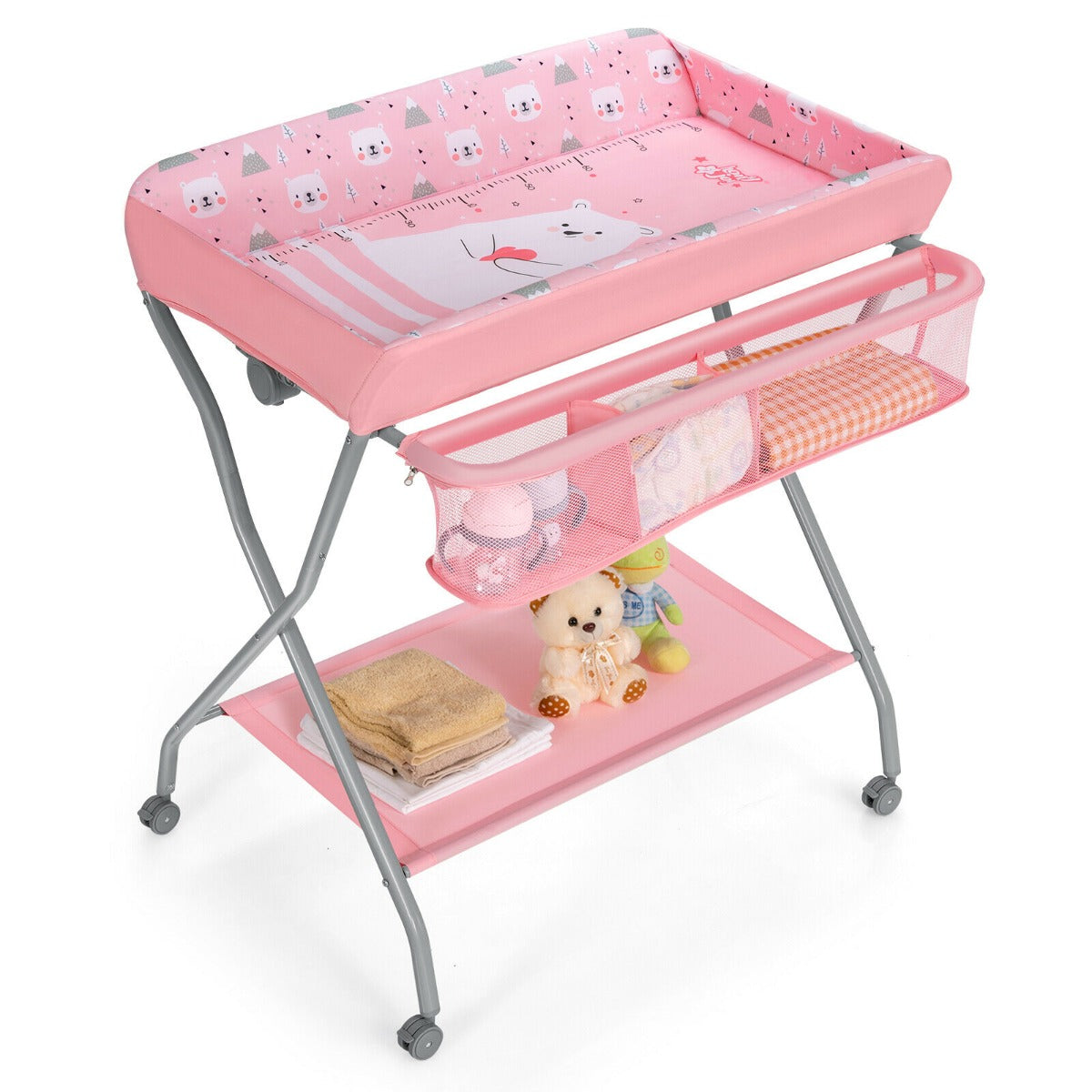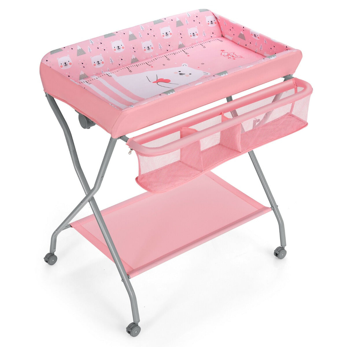 Rolling Baby Changing Table with Large Storage Basket-Pink
