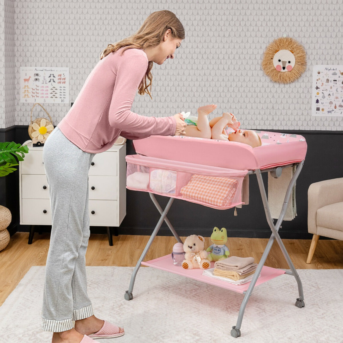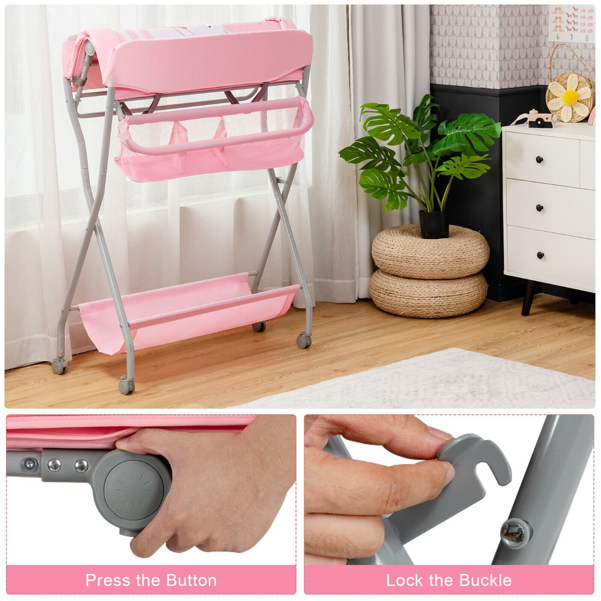 SKU: AG10001PI || Rolling Baby Changing Table with Large Storage Basket-Pink