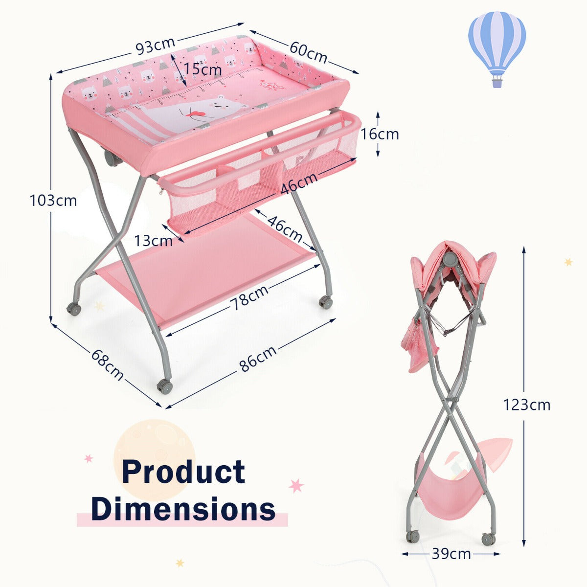 Box Qty:1(May vary by batch) Colour: Pink Material: Steel, Oxford cloth Overall dimensions: 93 cm x 73 cm x 103 cm (L x W x H) Folding size: 93 cm x 39 cm x 123 cm (L x W x H) Net weight: 8 kg Table top load-bearing: 25 kg Shelf load-bearing: 6 kg Recommended age: 0-12 months Package includes: 1 x Changing table 1 x Instruction manual