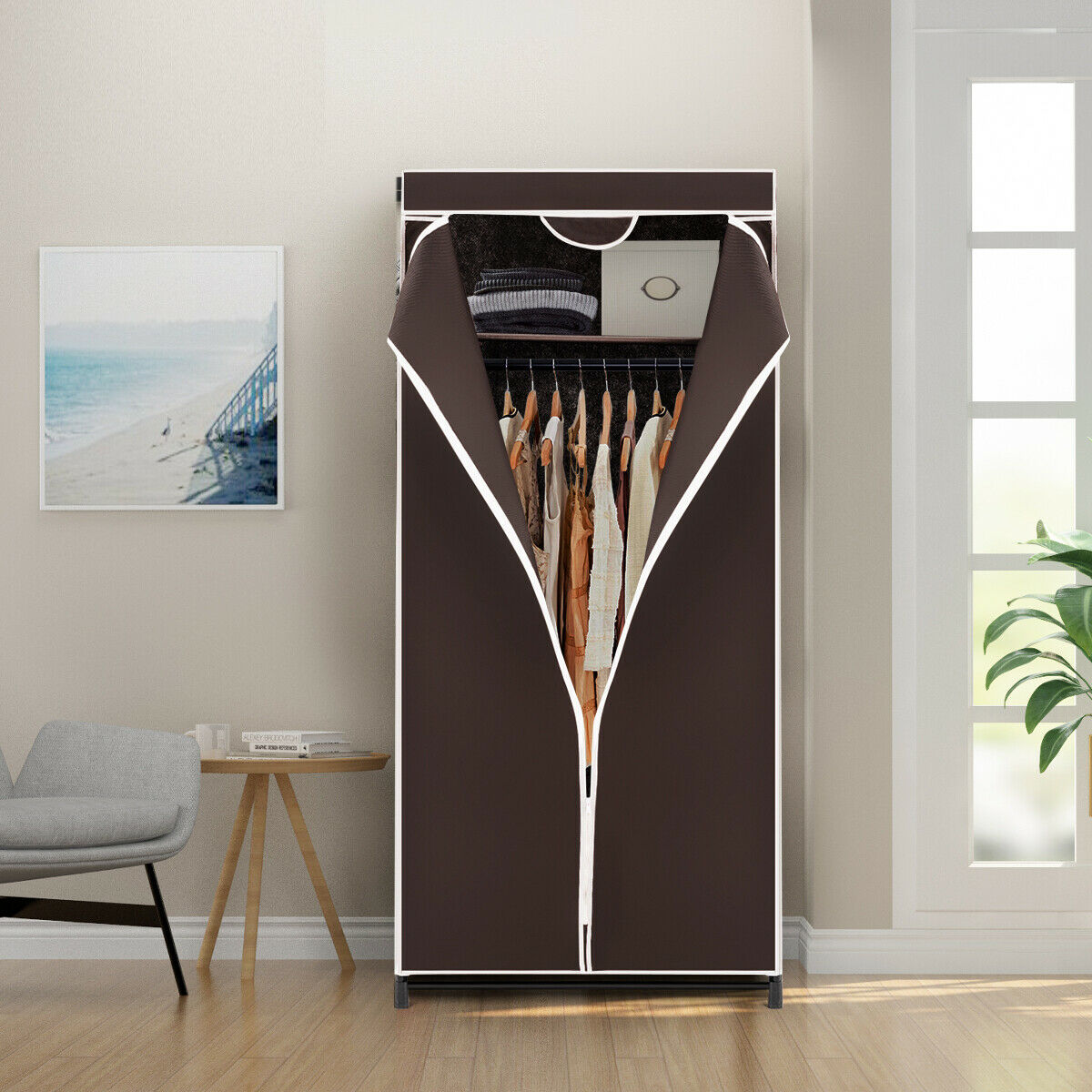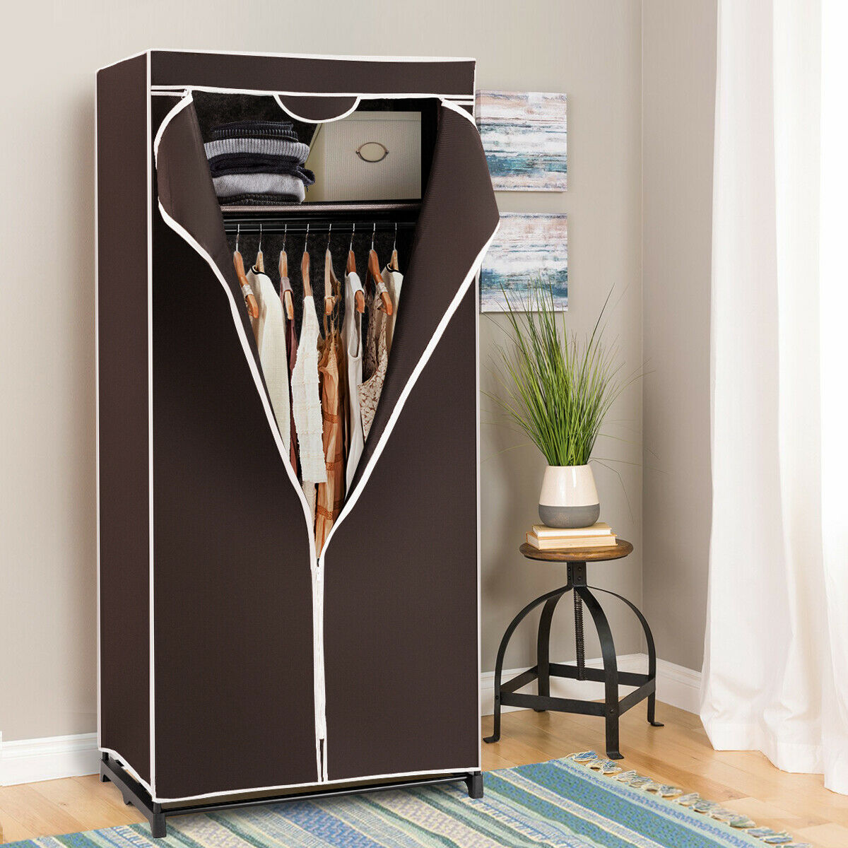 Single Canvas Wardrobe with Dust-proof Cover-Coffee
