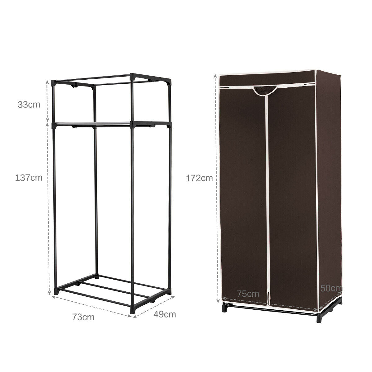 Need extra wardrobe space? This double canvas wardrobe maybe just the answer! Made from powder coated metal tubes with plastic connectors, this canvas wardrobe is 73cm wide with space top and bottom for stacking items. The canvas wardrobe has a middle zip which provides ample space to hang or remove clothes, whilst protecting clothes from mites, dust and smells. Light and easy to move when empty, this wardrobe is stable and durable and is easy to assemble following instructions provided. If you are looking for extra hanging space, don't hesitate to order it now! Easy to assemble following instructions provided. No tools required Powder-coated metal tubes, water and rust resistant Raised slightly off the ground for ventilation Spacious storage space with a hanging rail and space top and bottom to stack items Non-woven fabric cover with zip openings for ease of use Double canvas wardrobe suitable for clothes, blankets, shoes etc. Lightweight and compact suitable for temporary accomodation, bedsits, bedrooms etc. Firmly fixed together with powder coated metal tubes and plastic connectors