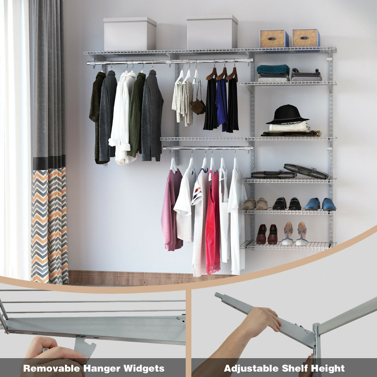 With an adjustable system, this closet organizer kit not only provides spacious storage space for your clothes, but allows you freely DIY it by adjusting the shelves and hanging rods horizontally or vertically, greatly fitting different spaces.This open clothing organizer is perfect for the bedroom, cloakroom and walk-in or reach-in closet, etc. If you are looking for a wall-mounted closet system like this, do not hesitate to place an order! Customize Your Needs: Thanks to its multiple holes on the uprights, this custom closet organizer allows you to freely adjust or reconfigure into different positions, which meet your various storage requirements. Meanwhile, you can also overlap the shorter shelves to create longer shelves as your needs. Spacious Storage Space: With 8 spacious shelving spaces, this clothing rail kit not only lets you put some casual clothes on the surface, but offers ample space for you to place storage boxes and handbags with ease. Besides, the 3 rods provide hanging space, which is perfect for your suits and long clothes. Sturdy and Durable Construction: Made of high-quality steel, this wall-mounted wire shelving unit is not easy to break or deform with high strength and strong bearing capacity. The powder-coated surface treatment process is anti-corrosive and rustproof, which ensures long-term durability. Versatile Use: With flexible configuration and wide installation range, this wall garment rack is perfect for your bedroom, cloakroom and walk-in or reach-in closet, making the most of your indoor space. Furthermore, the open storage space with ventilated design keeps clothes dry while easy to access. Easy Installation and Cleaning: With detailed assembly instruction and all hardware delivered, it is easy to DIY your wardrobe adjustable metal rail within several minutes. And its sleek finish facilitates daily maintenance, the stains left on it can be quickly wiped with a soft damp cloth.