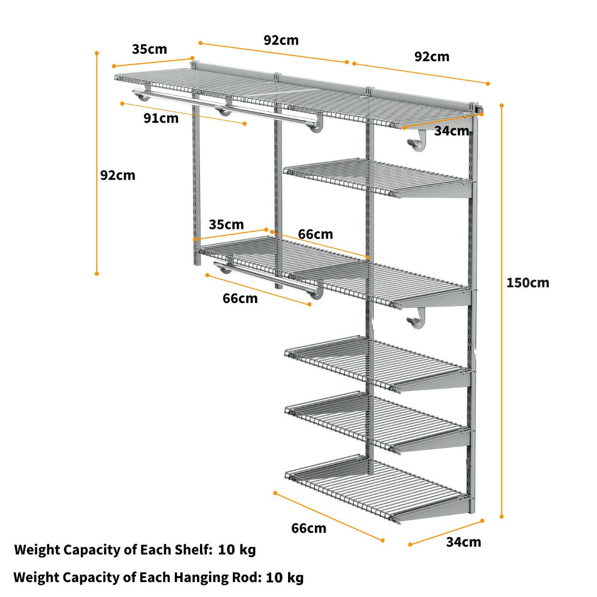 Box Qty:1(May vary by batch) Colour: Grey Material: Iron Product dimensions: 184 x 35 x 150 cm ( L x W x H) Net weight: 14 kg Weight capacity of each shelf: 10 kg Weight capacity of each hanging rod: 10 kg Package includes: 2 cm x 92 cm shelves 6 cm x 66 cm shelves 2 cm x 92 cm top rails 15 x brackets 4 cm x 92 cm uprights 2 cm x 57 cm upright extensions 3 x Hang rods 6 x Hooks 4 x Rail covers 1 x Instruction manual